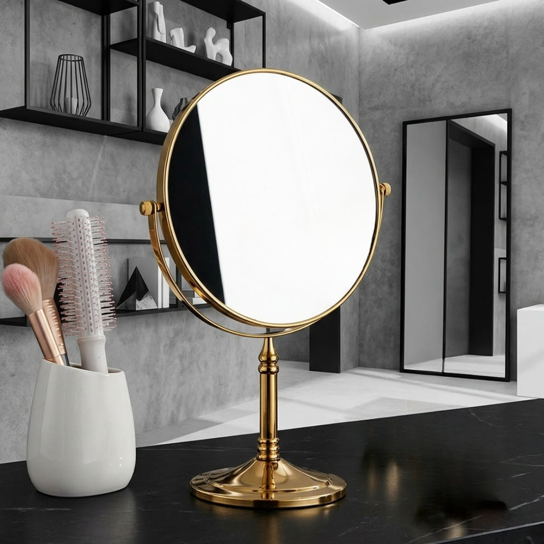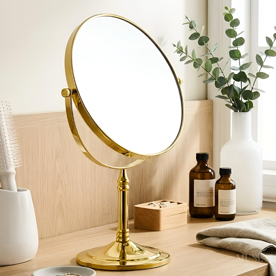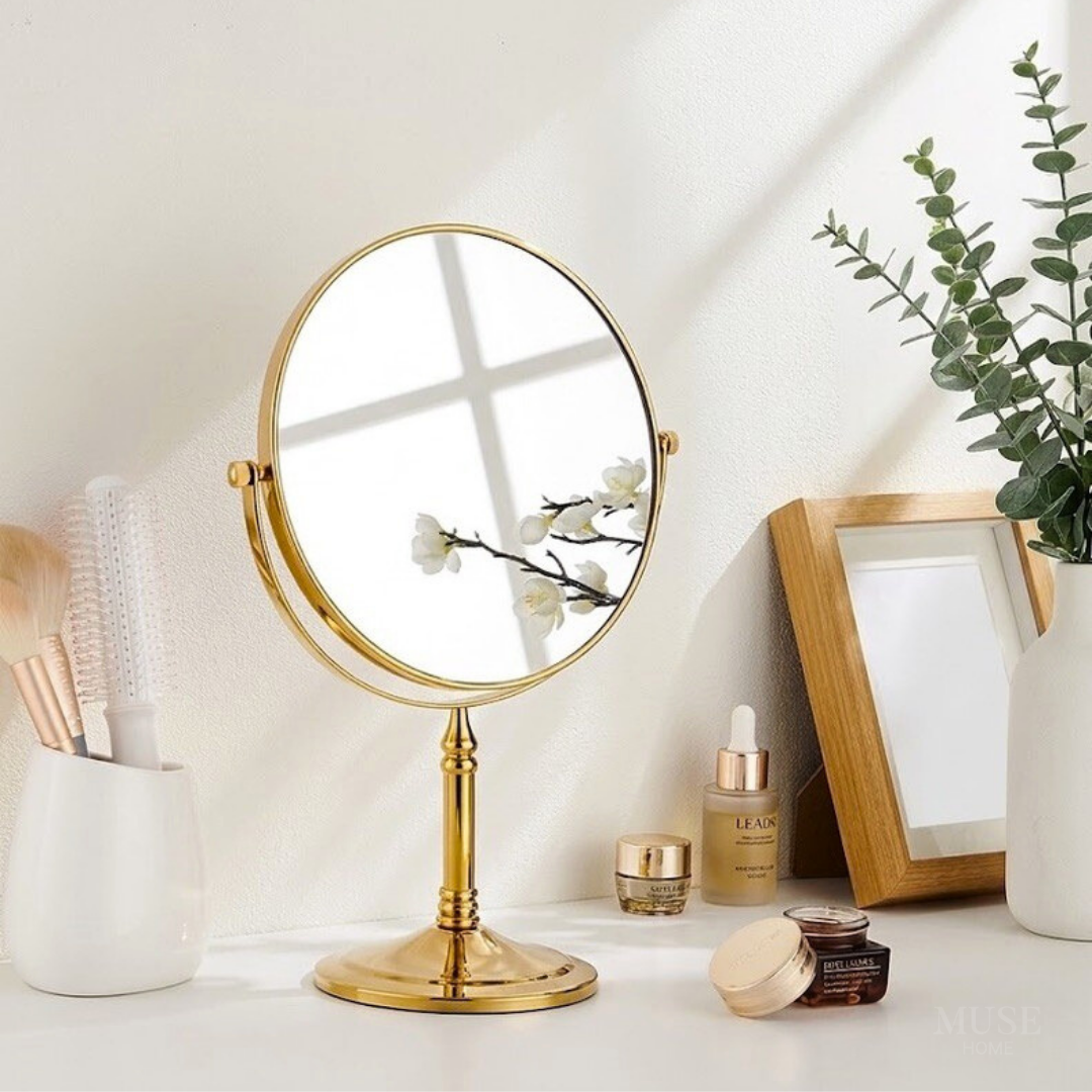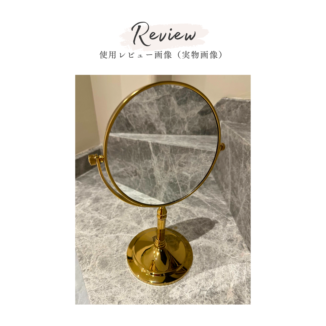 美しいゴールドフレームが印象的な、上品な卓上メイクミラー。