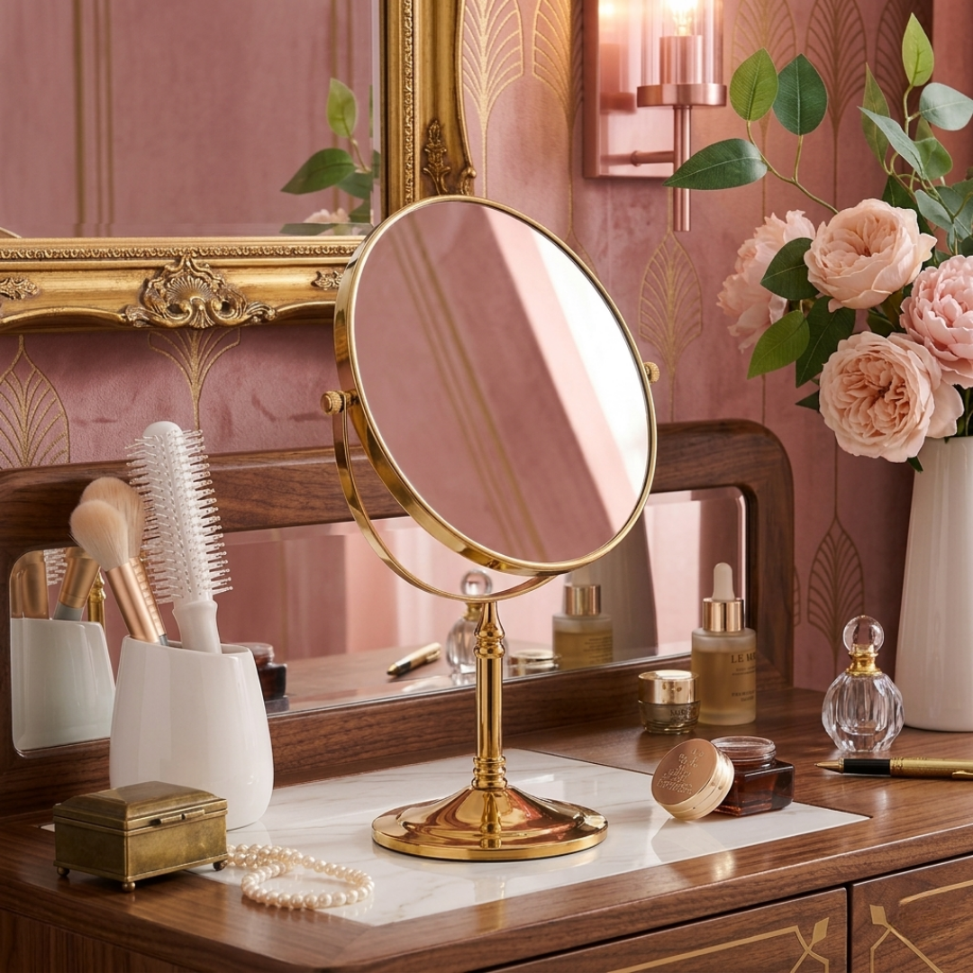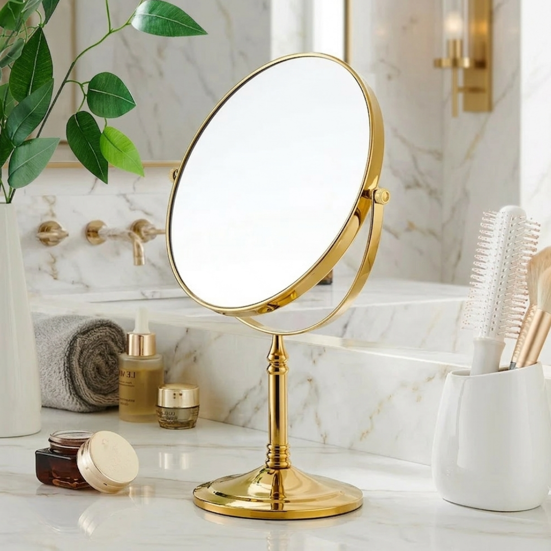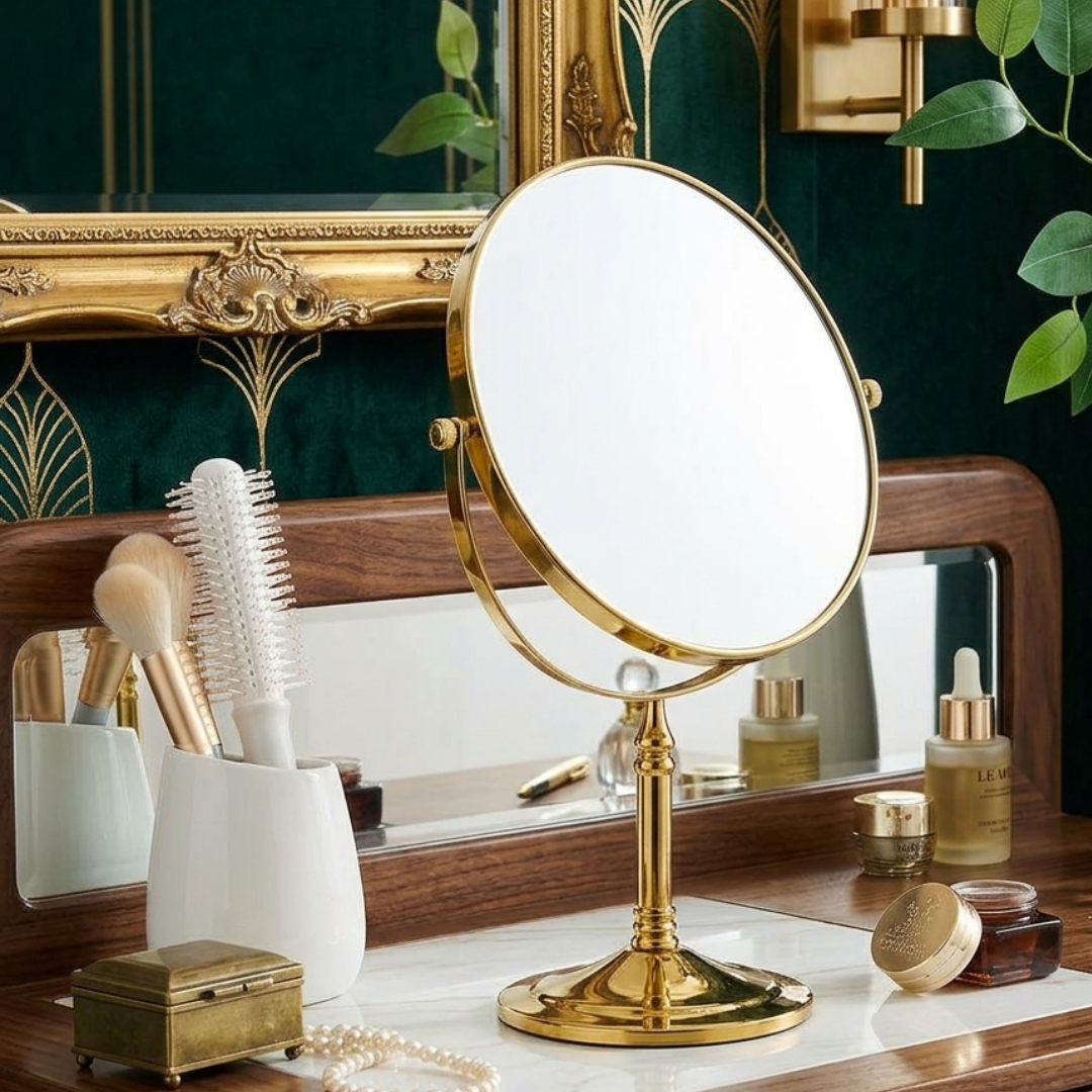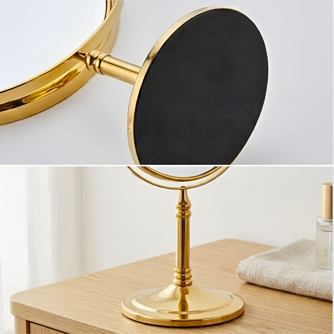 美しいゴールドフレームが印象的な、上品な卓上メイクミラー。