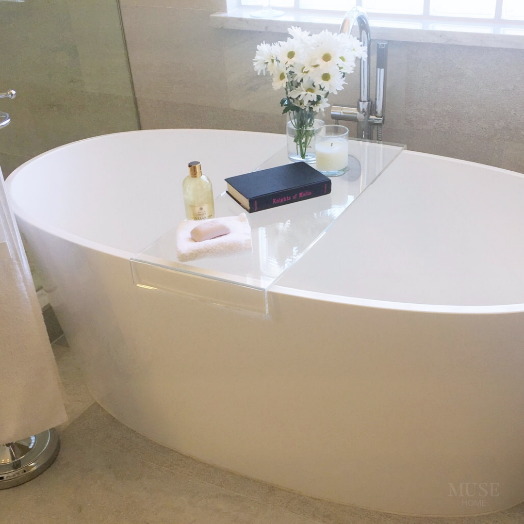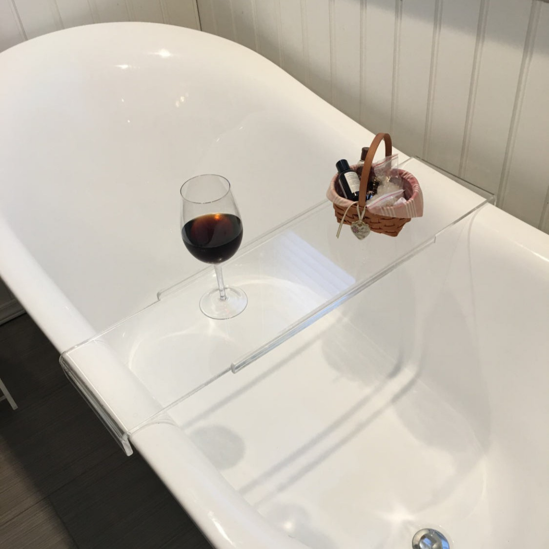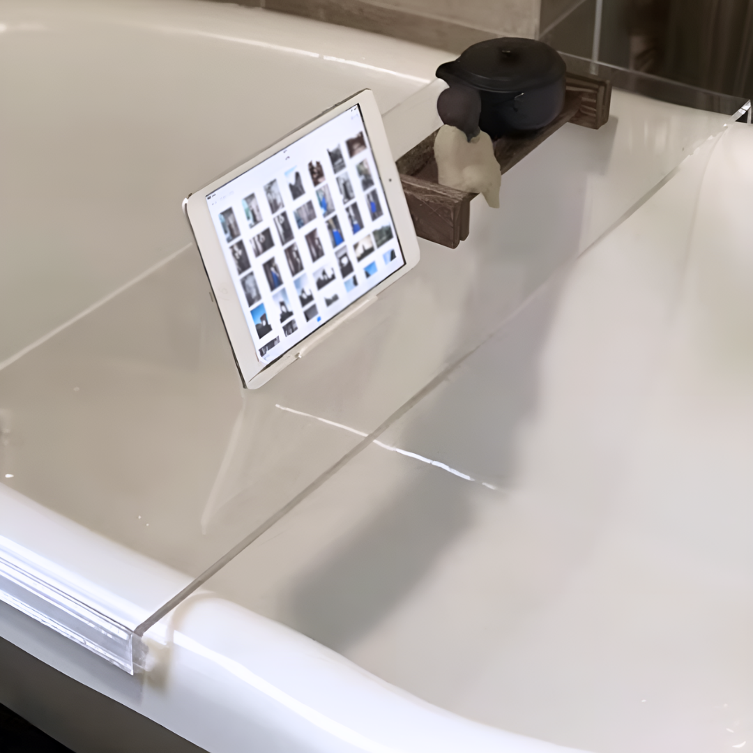 バスタイムを充実させるクリアのバスタブシェルフ。